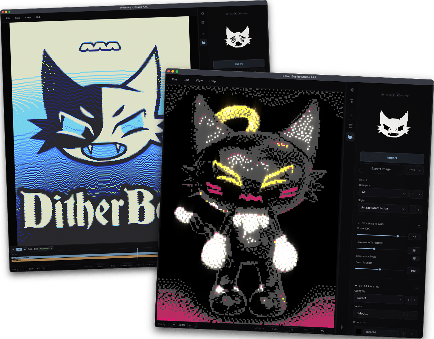 Dither Boy is all-in-one software for authentic retro image, video, and animation dithering. Featuring 63 unique dithering algorithms, a stackable effects pipeline, and full color support, Dither Boy gives you unrestricted access to advanced creative error diffusion, bitmap, halftone, and modulation effects like never before!